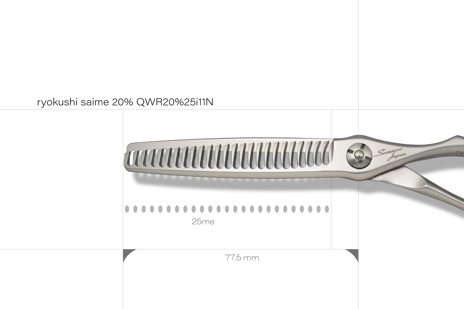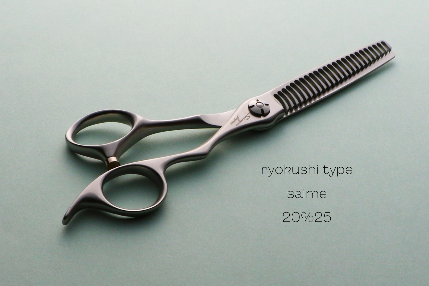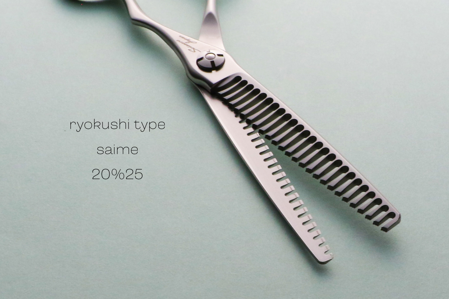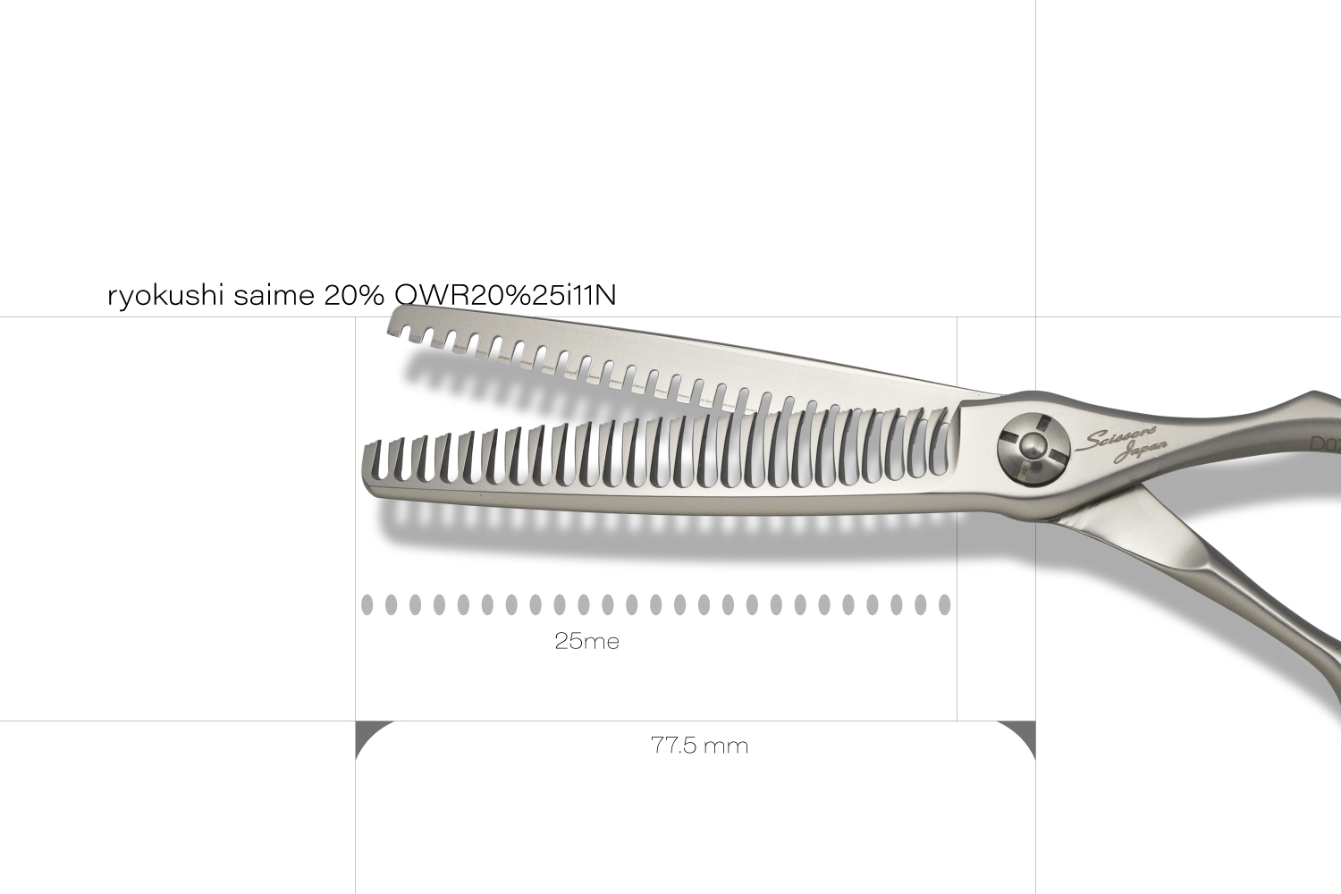 最大の特徴は、静刃側と動刃側の両側が櫛刃形状になっていることです。両櫛刃に設計することでシザーを閉じてパネルから抜く際に髪に擦れる刃が隙間に出ないことで、どの方向でも抜くことが可能なのと髪に対するダメージを与えることがありません。カット率は、顔回りなどの細かな調整が必要な部分から全体毛量の調整まで対応可能な20%に設定されています。カット率が多くないので安心して使うことができます。ハンドルは、標準より少し小さい手にフィットするキャメルのオフセットタイプとなります。シザーが安定して疲れにくい形状です。