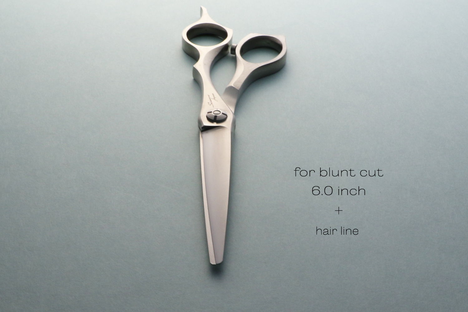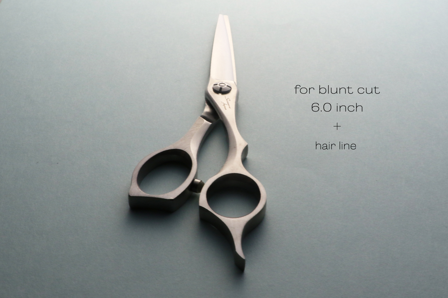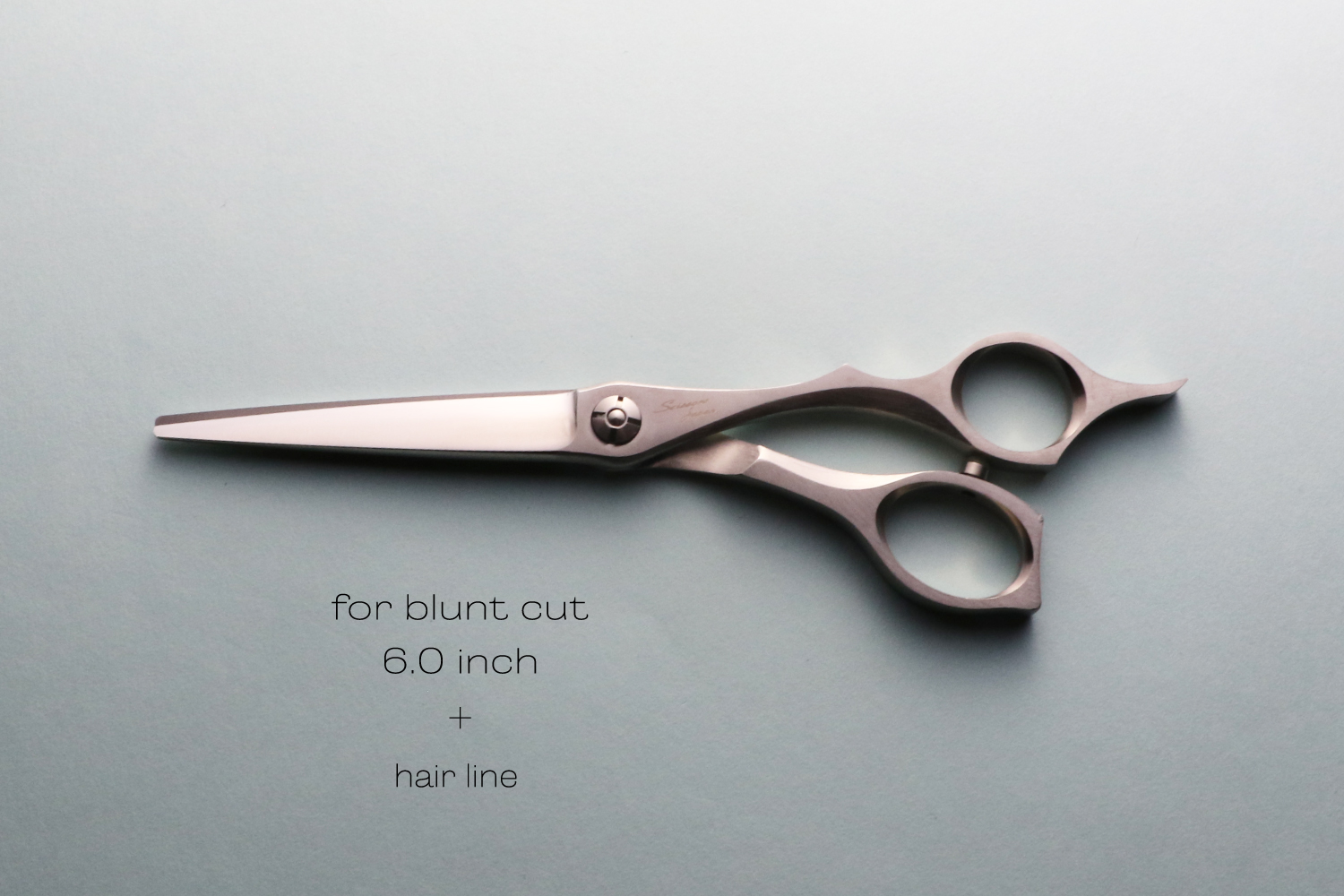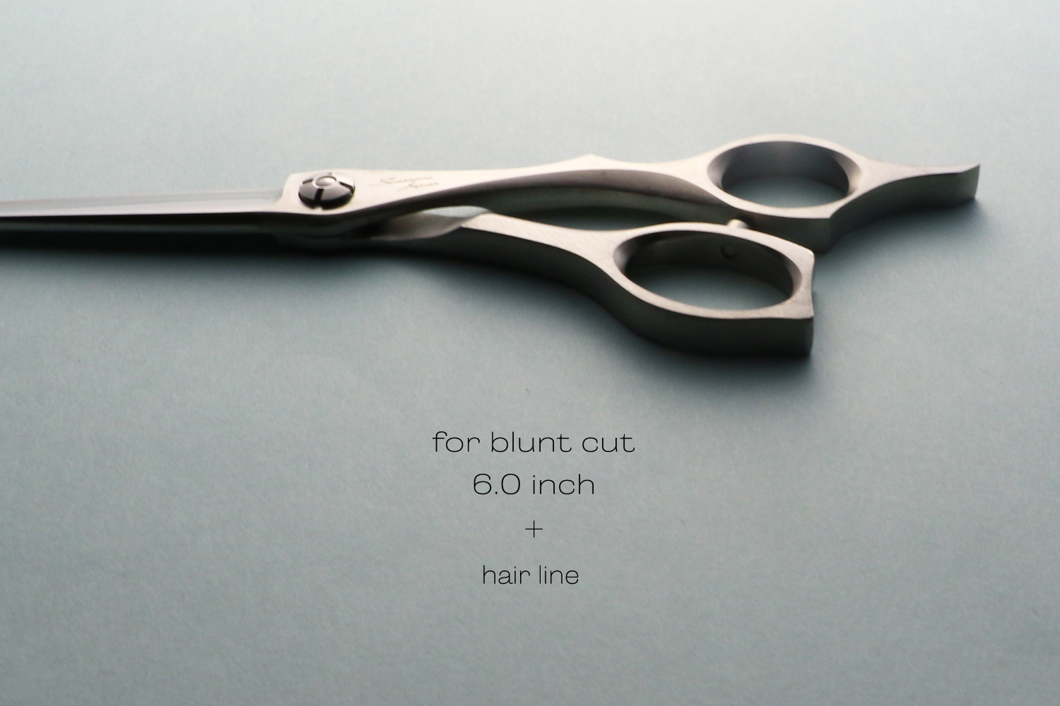 真っすぐなカットラインで切るために逃げにくく設計された6.0インチのブラントカットに適したカットシザーです。刃の特徴は、逃げにくく設計された刃線、刃の鋭さをつくる刃幅、力を生み出す体積のバランスが取れたサクサク切り負けないパワフルなところです。ハンドルは、剛性が非常に高いしっかりとした形状でハンドルから刃に力を減力することなく伝えることができるので軽い力で切ることができます。指穴は、手の大きな方でも入る標準よりも少し大きく作られています。手の小さい方は、指穴リングを使うとちょうどいいサイズになります。表面加工にヘアラインを施しているので、格好いい独特な質感が楽しめます。