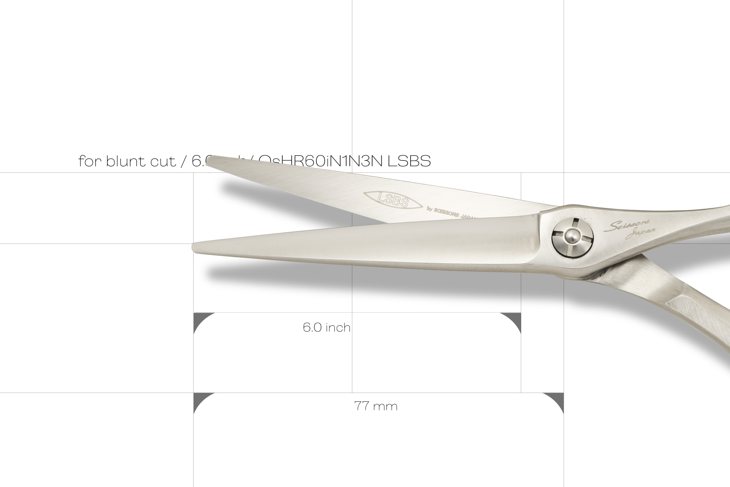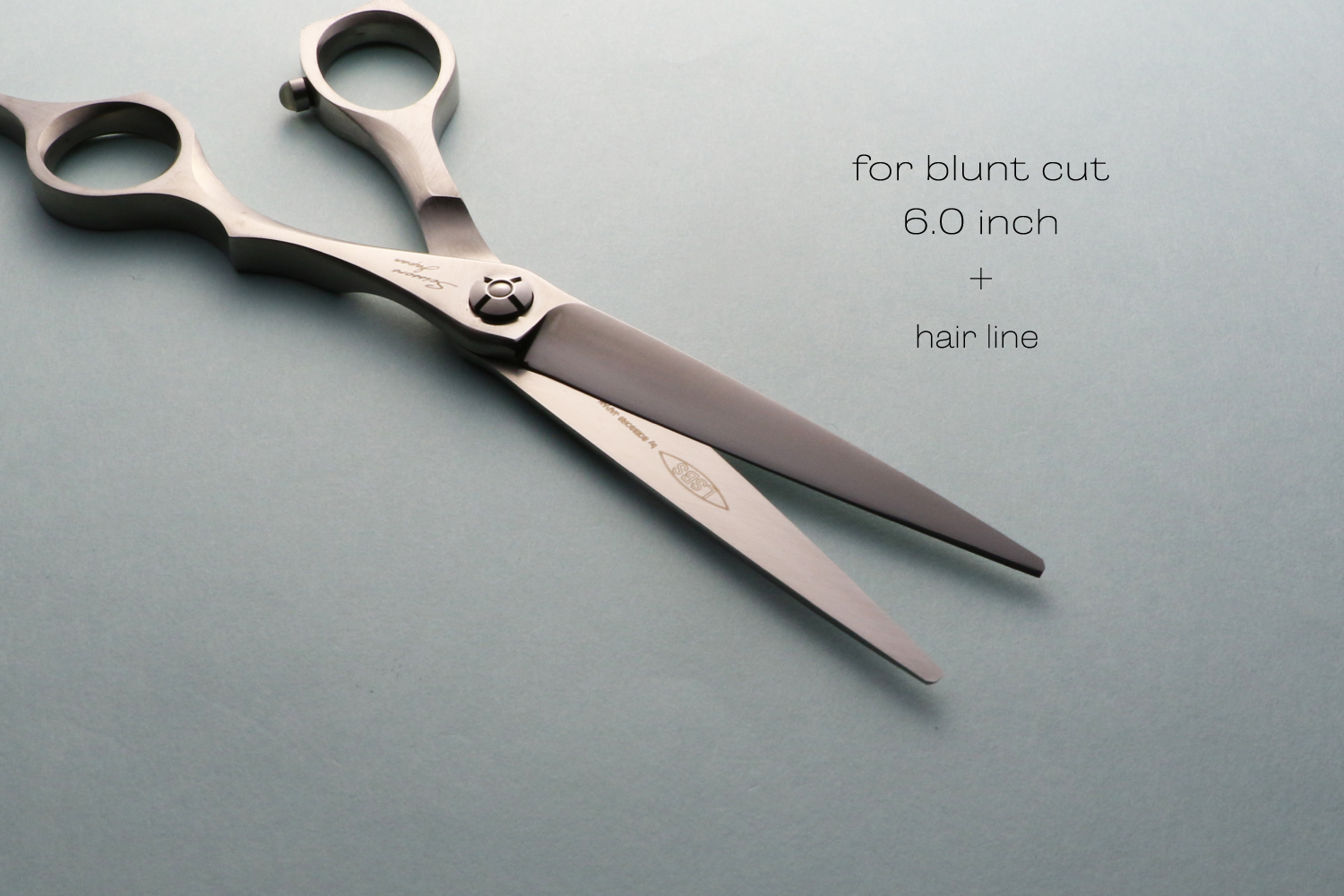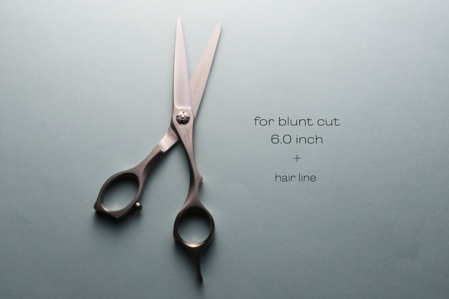 真っすぐなカットラインで切るために逃げにくく設計された6.0インチのブラントカットに適したカットシザーです。刃の特徴は、逃げにくく設計された刃線、刃の鋭さをつくる刃幅、力を生み出す体積のバランスが取れたサクサク切り負けないパワフルなところです。ハンドルは、剛性が非常に高いしっかりとした形状でハンドルから刃に力を減力することなく伝えることができるので軽い力で切ることができます。指穴は、手の大きな方でも入る標準よりも少し大きく作られています。手の小さい方は、指穴リングを使うとちょうどいいサイズになります。表面加工にヘアラインを施しているので、格好いい独特な質感が楽しめます。