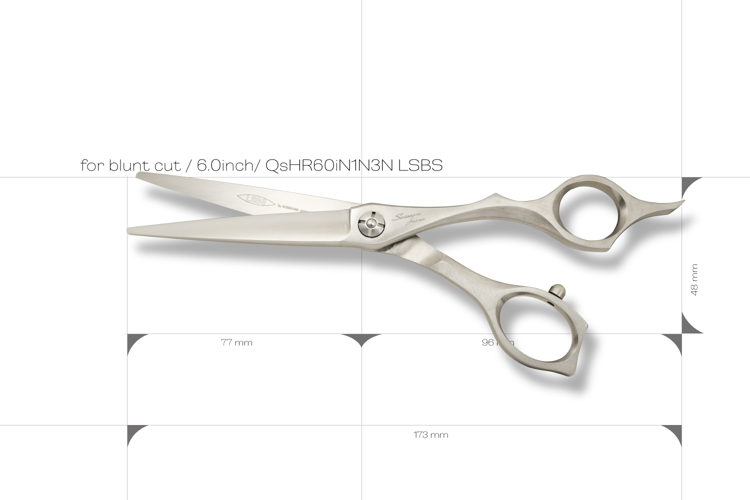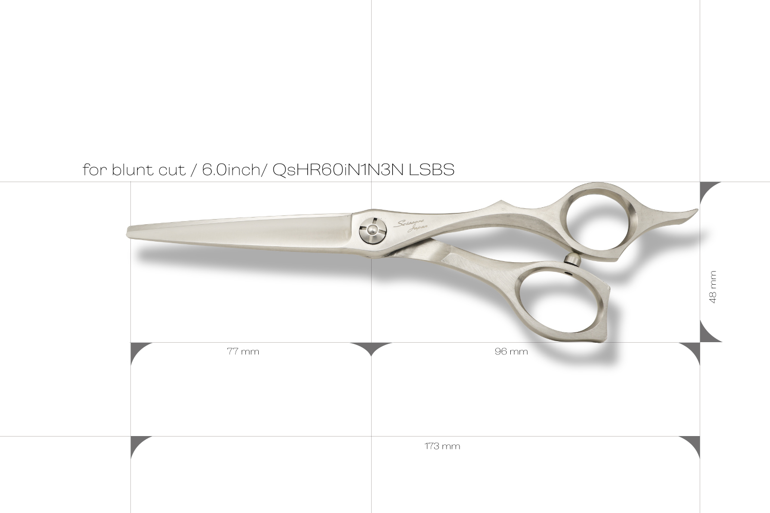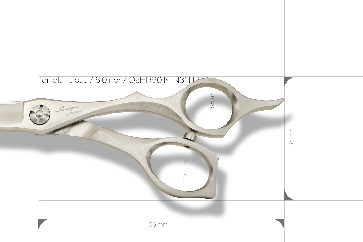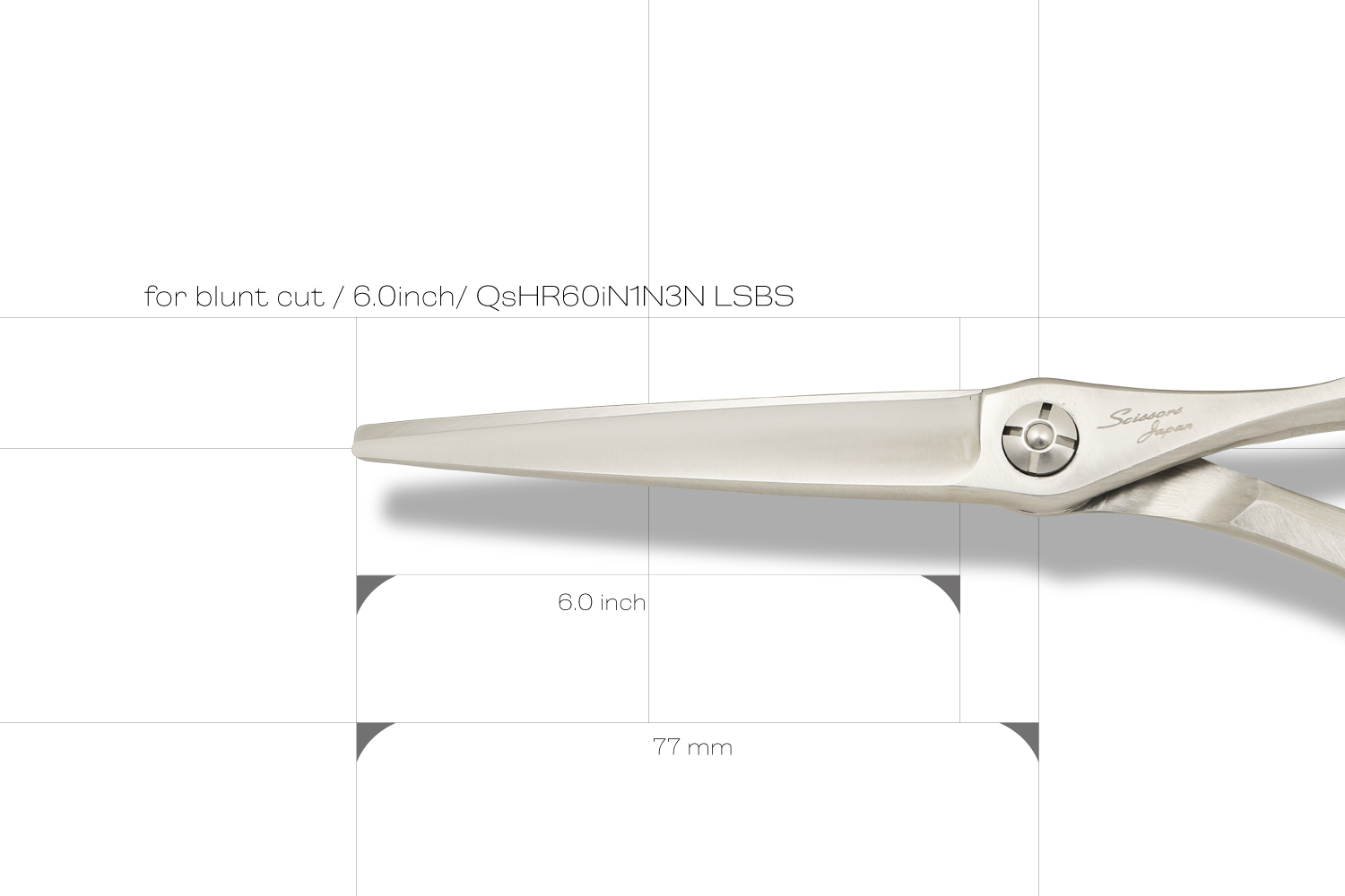 真っすぐなカットラインで切るために逃げにくく設計された6.0インチのブラントカットに適したカットシザーです。刃の特徴は、逃げにくく設計された刃線、刃の鋭さをつくる刃幅、力を生み出す体積のバランスが取れたサクサク切り負けないパワフルなところです。ハンドルは、剛性が非常に高いしっかりとした形状でハンドルから刃に力を減力することなく伝えることができるので軽い力で切ることができます。指穴は、手の大きな方でも入る標準よりも少し大きく作られています。手の小さい方は、指穴リングを使うとちょうどいいサイズになります。表面加工にヘアラインを施しているので、格好いい独特な質感が楽しめます。