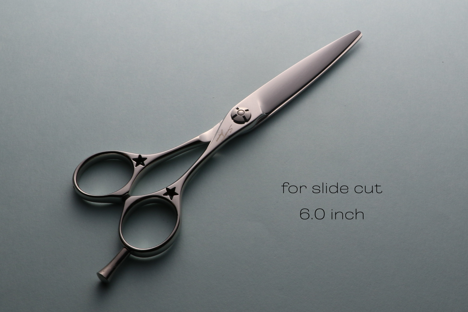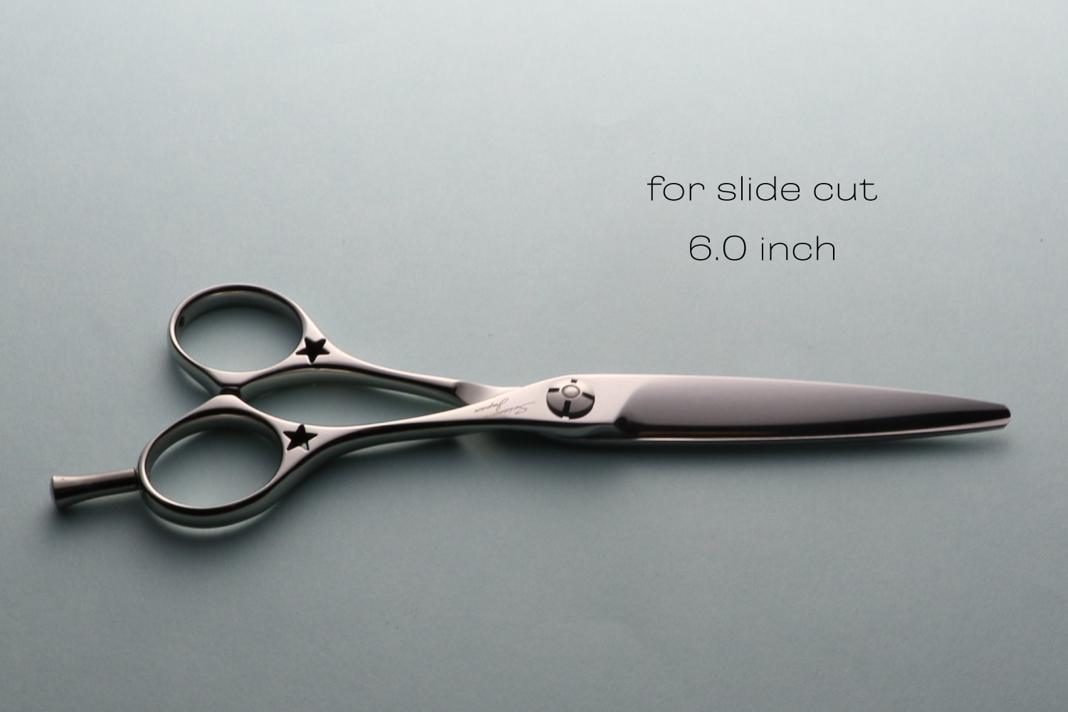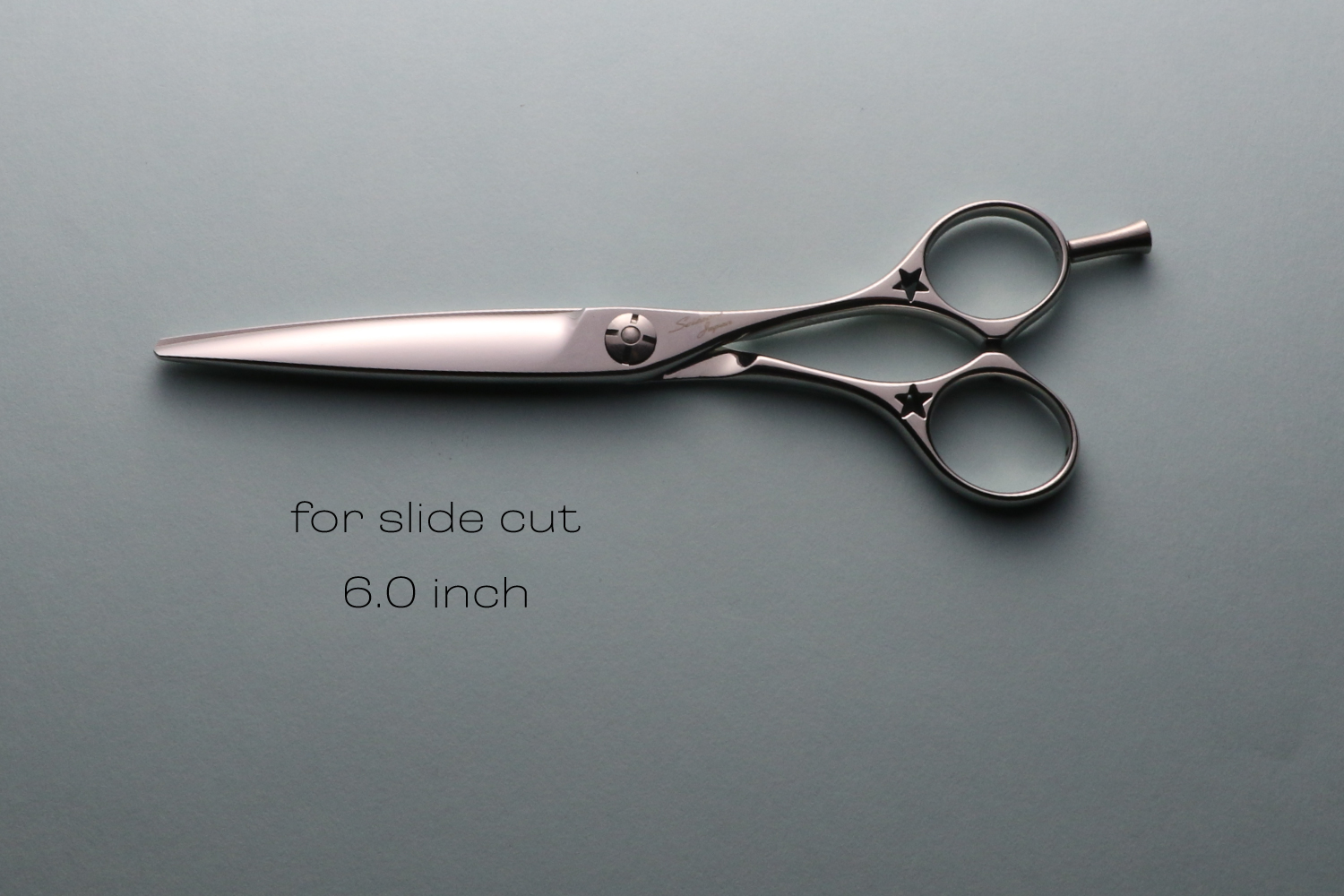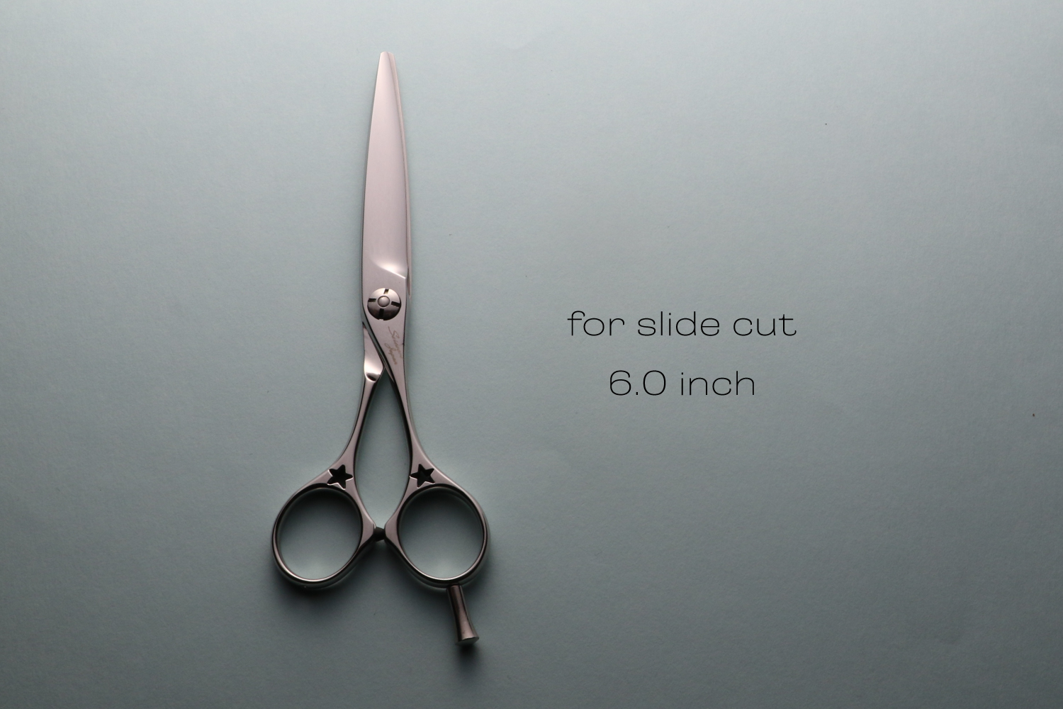 やわらかい質感づくりがしやすい笹刃の6.0インチのスライドカットシザーです。ちょうどいい滑り具合でスライドカットだけでなく、ストロークカットなどもいけます。刃長が6.0インチあり、スライドストロークを長くとることができるのでロングのスタイルにも活躍すると思います。刃の重量が軽く6.0インチでも操作性の良さを感じることができます。ハンドルは、手に収まりが良いコンパクトなメガネタイプとなっていて、操作性が良く狙ったポイントに刃を当てやすいです。操作性の良い笹刃なので、これからスライドカットを始めようと考えている方や手が小さな方にもおすすめのシザーです。