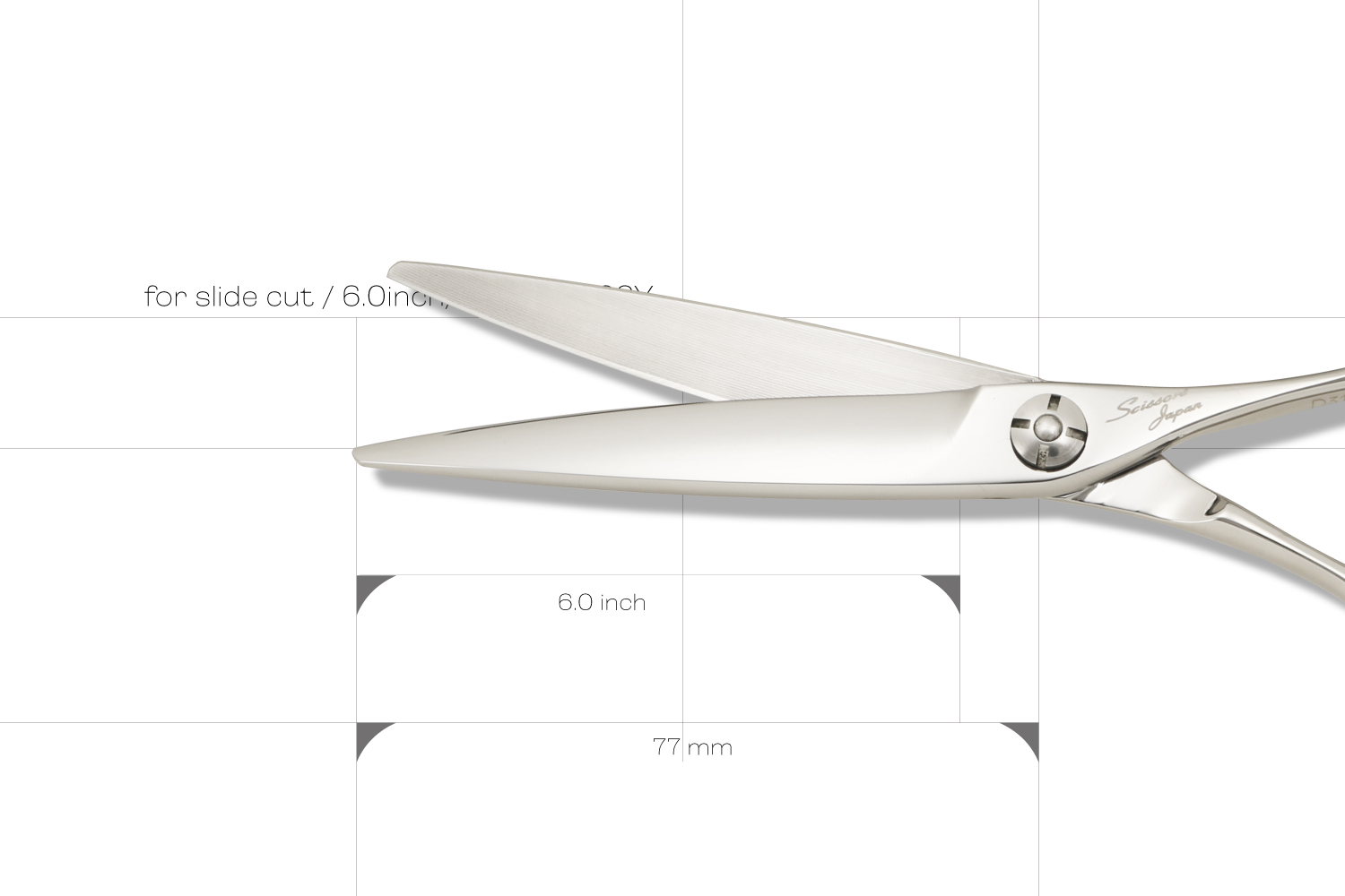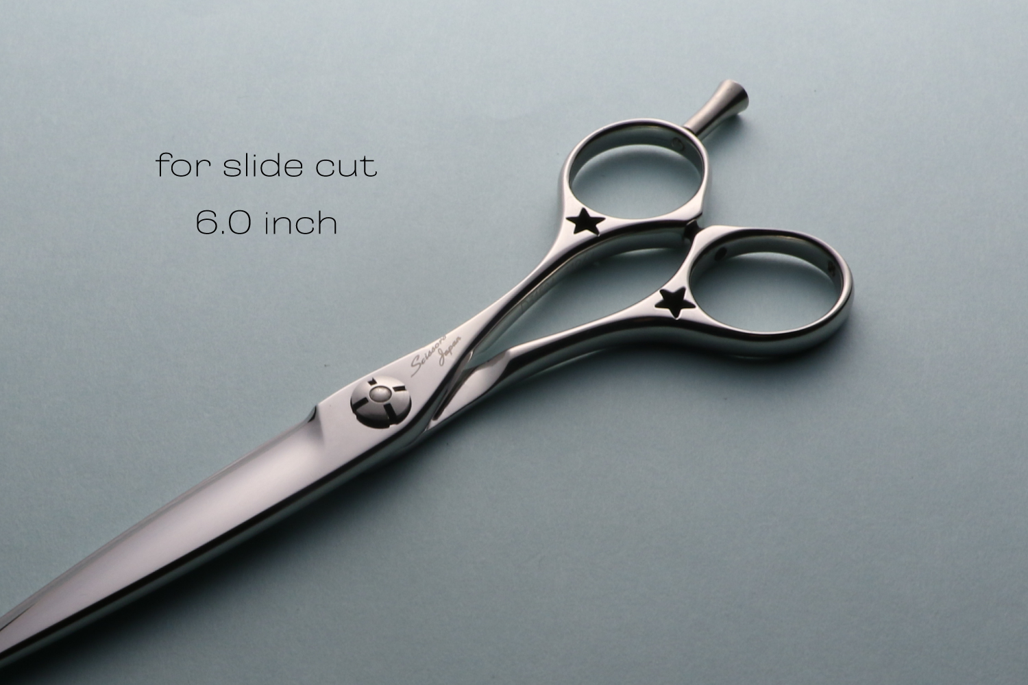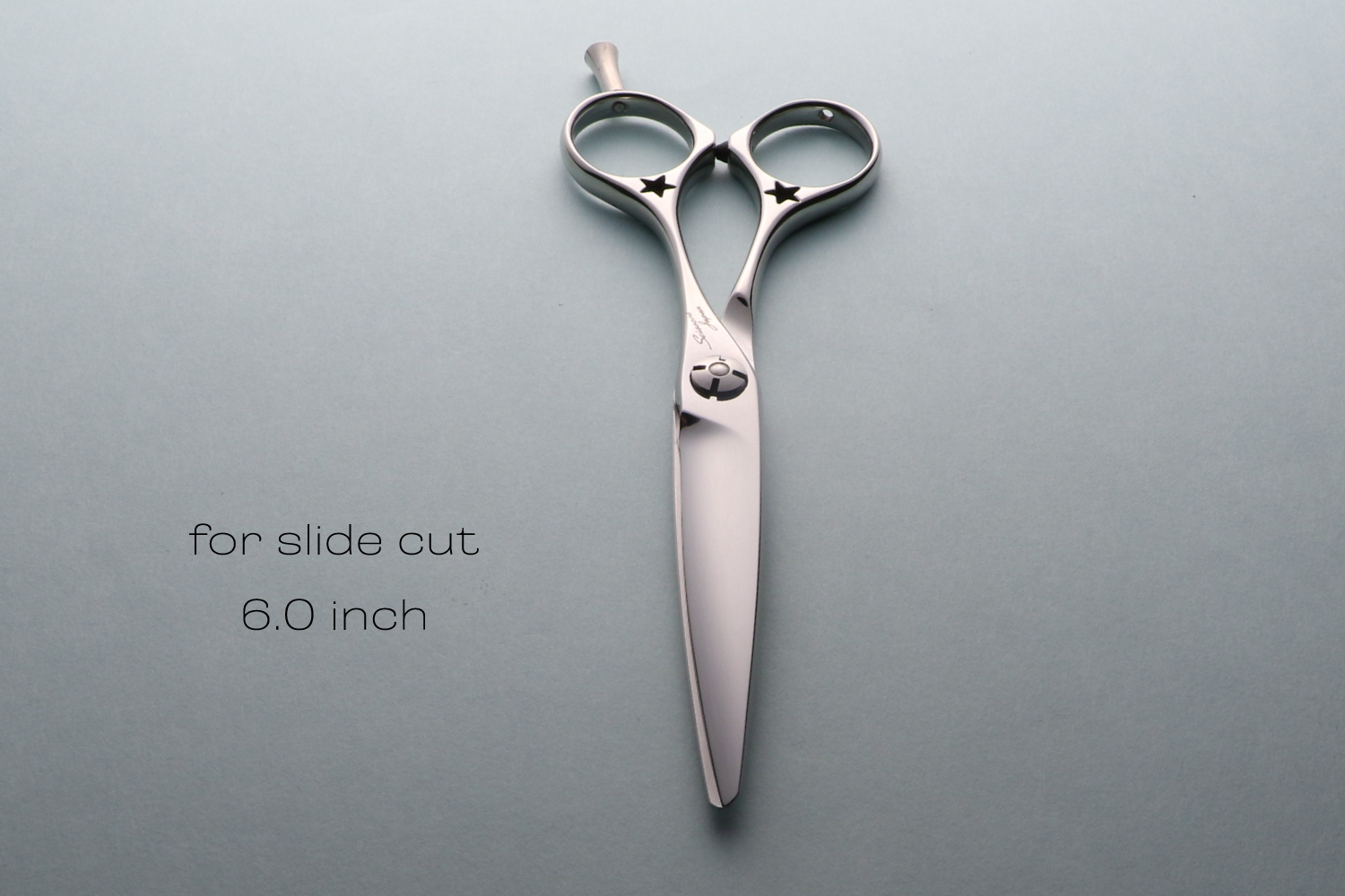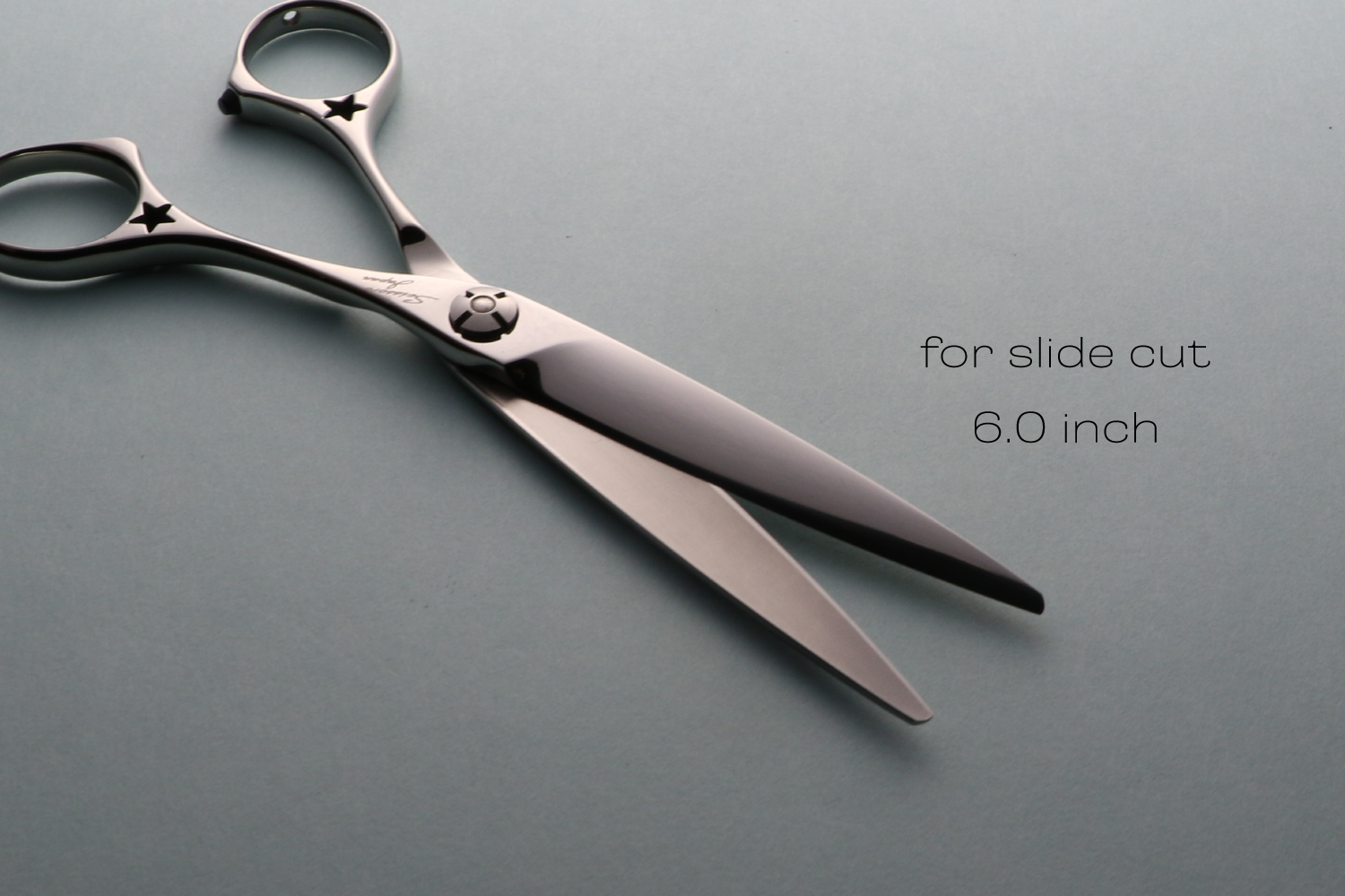 やわらかい質感づくりがしやすい笹刃の6.0インチのスライドカットシザーです。ちょうどいい滑り具合でスライドカットだけでなく、ストロークカットなどもいけます。刃長が6.0インチあり、スライドストロークを長くとることができるのでロングのスタイルにも活躍すると思います。刃の重量が軽く6.0インチでも操作性の良さを感じることができます。ハンドルは、手に収まりが良いコンパクトなメガネタイプとなっていて、操作性が良く狙ったポイントに刃を当てやすいです。操作性の良い笹刃なので、これからスライドカットを始めようと考えている方や手が小さな方にもおすすめのシザーです。