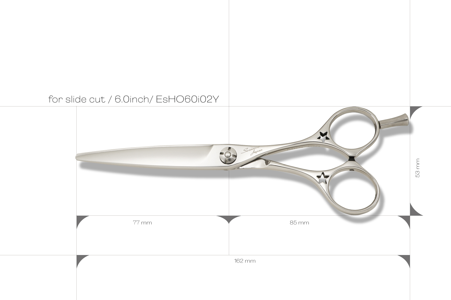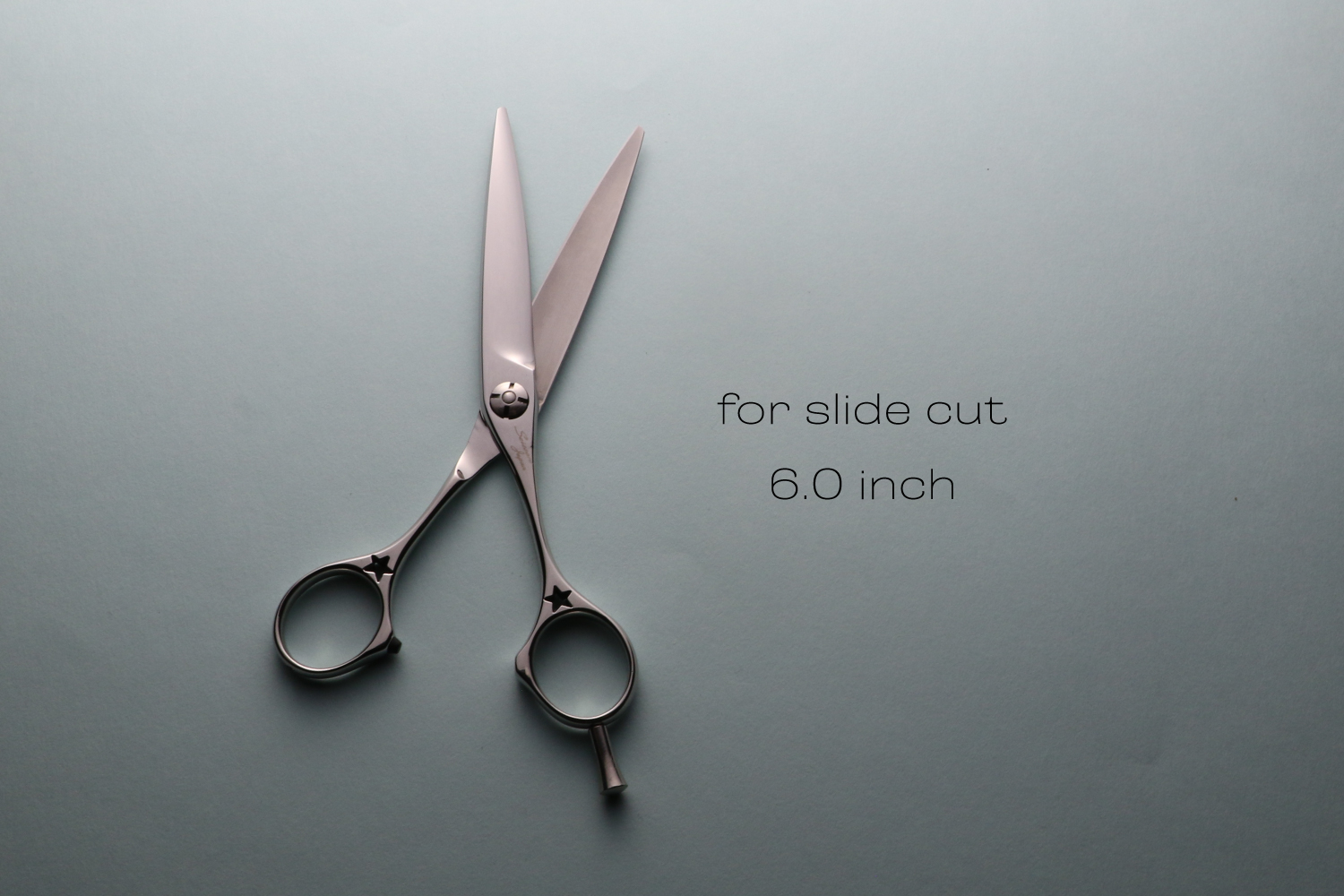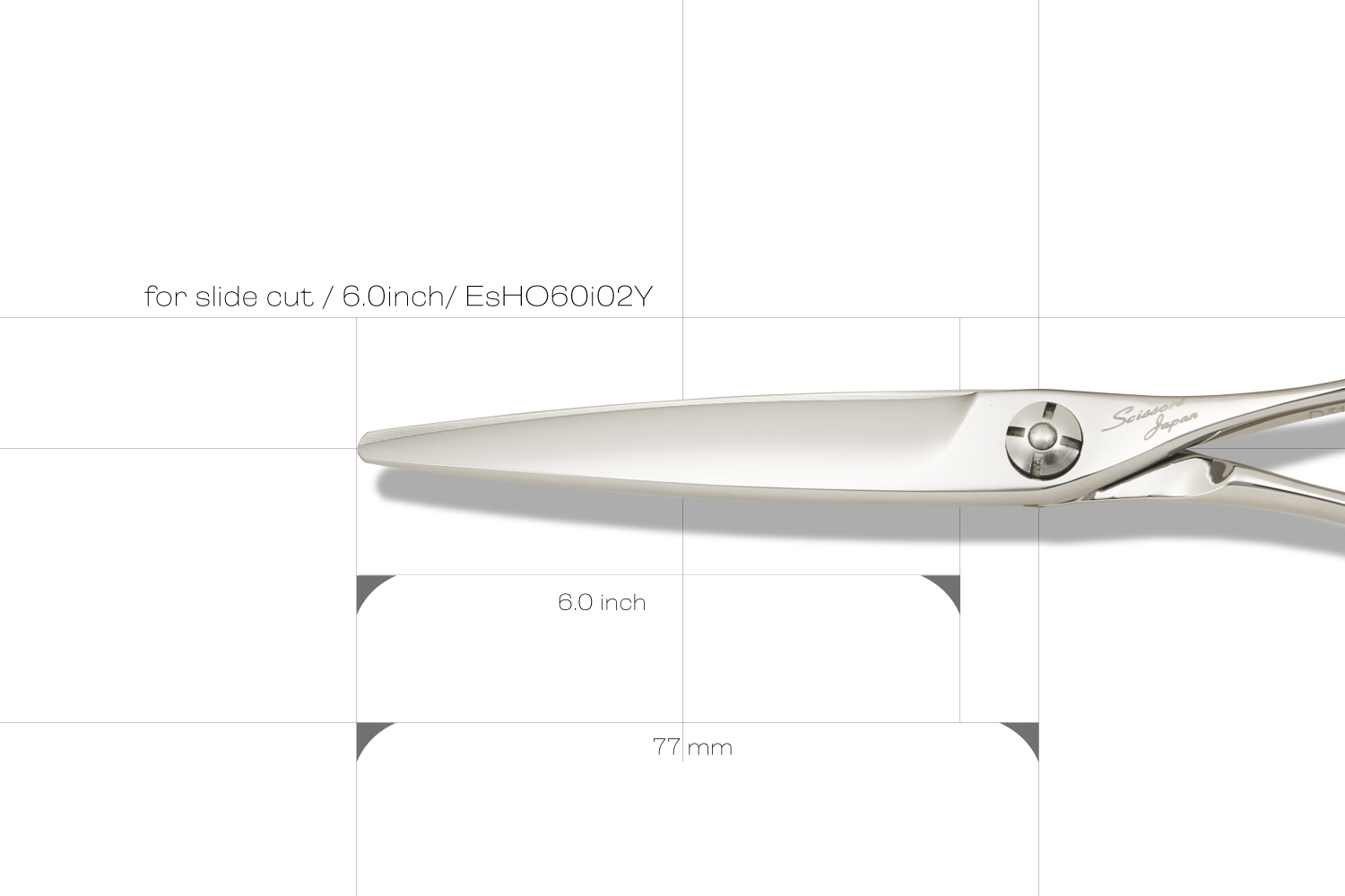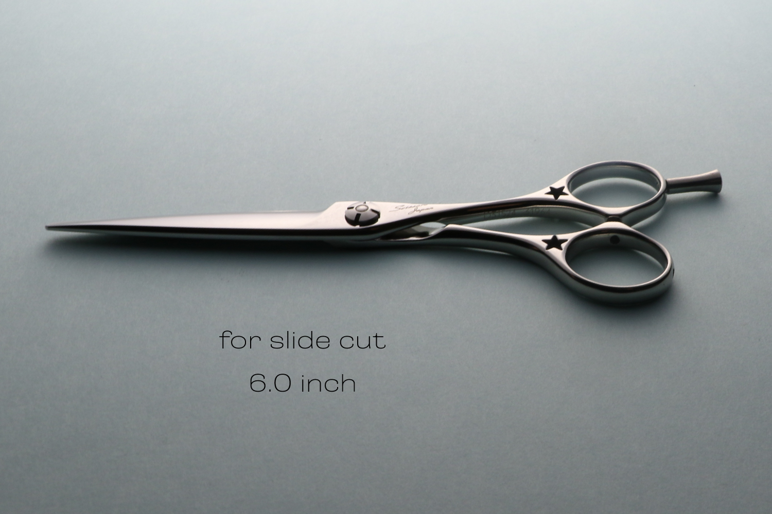 やわらかい質感づくりがしやすい笹刃の6.0インチのスライドカットシザーです。ちょうどいい滑り具合でスライドカットだけでなく、ストロークカットなどもいけます。刃長が6.0インチあり、スライドストロークを長くとることができるのでロングのスタイルにも活躍すると思います。刃の重量が軽く6.0インチでも操作性の良さを感じることができます。ハンドルは、手に収まりが良いコンパクトなメガネタイプとなっていて、操作性が良く狙ったポイントに刃を当てやすいです。操作性の良い笹刃なので、これからスライドカットを始めようと考えている方や手が小さな方にもおすすめのシザーです。