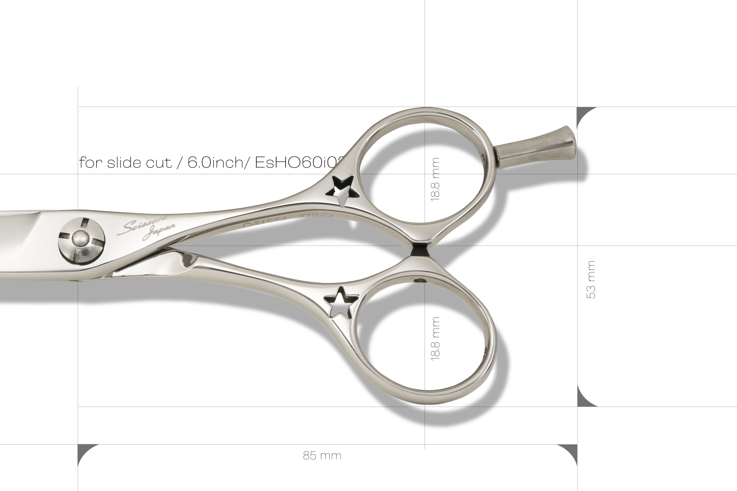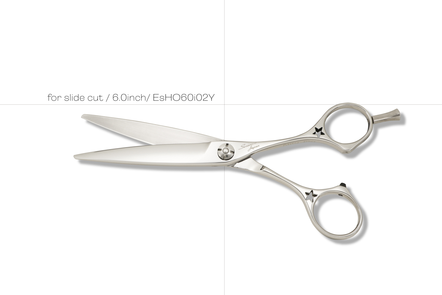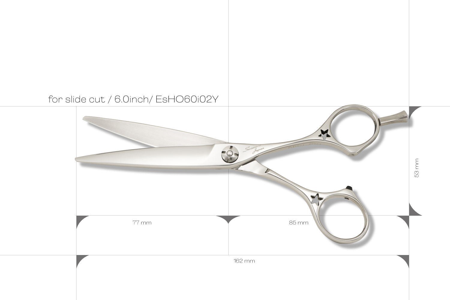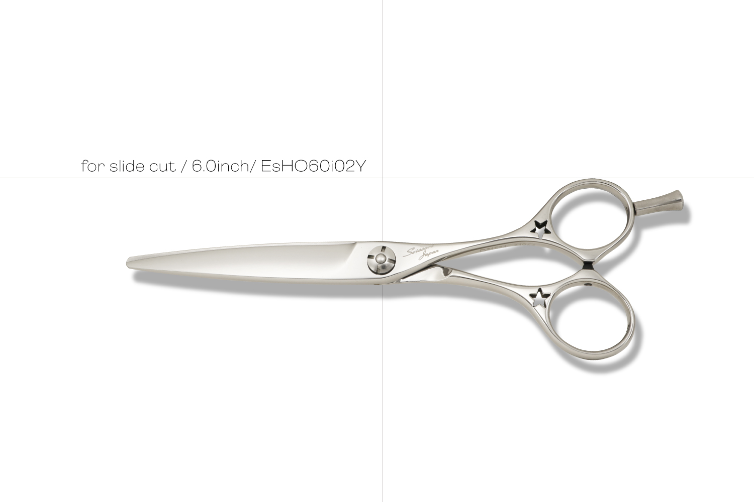 やわらかい質感づくりがしやすい笹刃の6.0インチのスライドカットシザーです。ちょうどいい滑り具合でスライドカットだけでなく、ストロークカットなどもいけます。刃長が6.0インチあり、スライドストロークを長くとることができるのでロングのスタイルにも活躍すると思います。刃の重量が軽く6.0インチでも操作性の良さを感じることができます。ハンドルは、手に収まりが良いコンパクトなメガネタイプとなっていて、操作性が良く狙ったポイントに刃を当てやすいです。操作性の良い笹刃なので、これからスライドカットを始めようと考えている方や手が小さな方にもおすすめのシザーです。